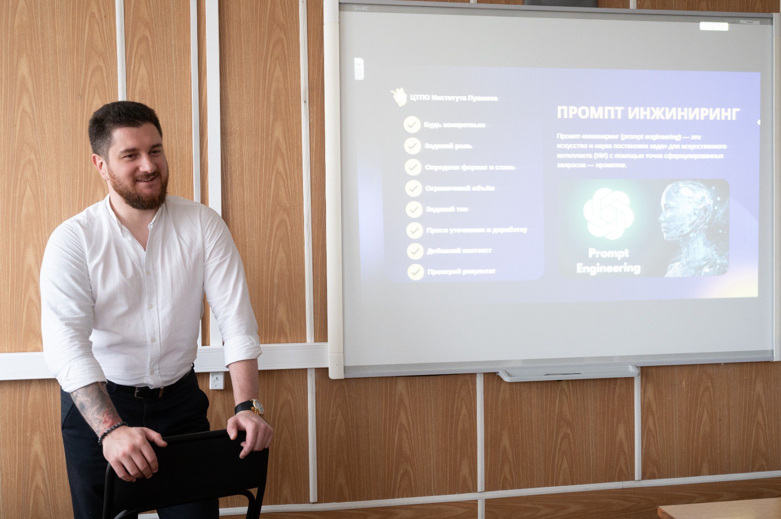 Начальник управления цифровизации Вячеслав Самойлов провёл мастер-класс по использованию нейросетей для создания блога. Ребята узнали, как создавать контент через личный бренд, писать промпты при работе с генеративными языковыми моделями ИИ, создавать медиаплан публикаций.