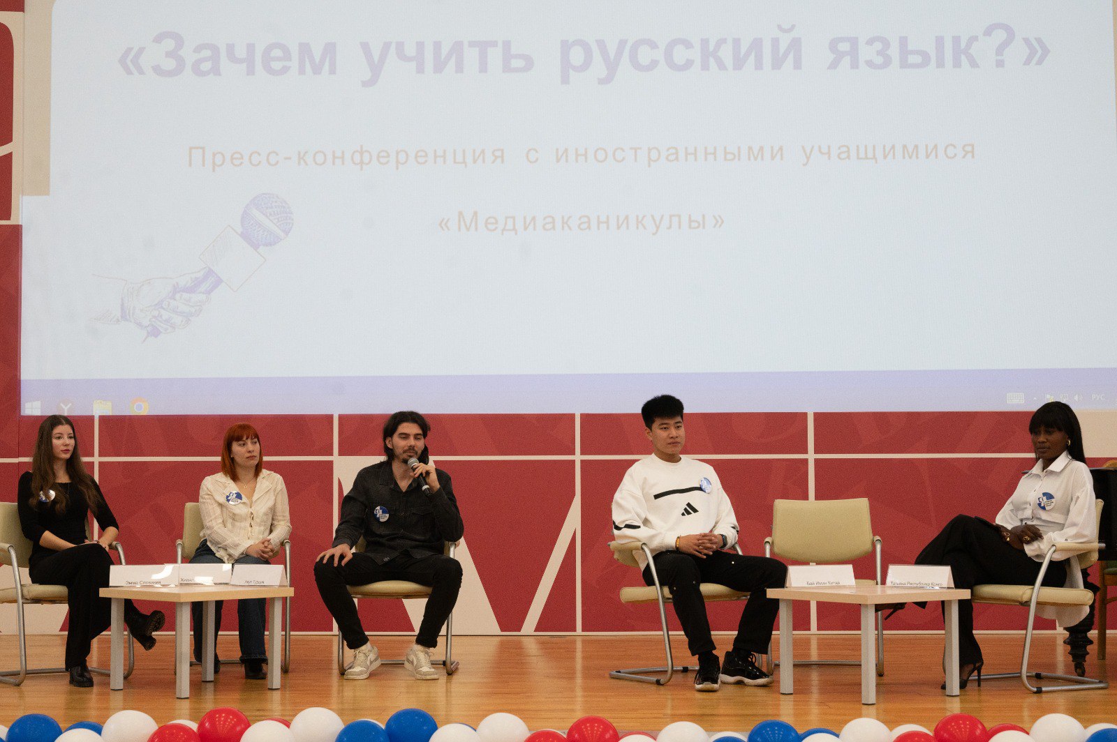 Интерактивная часть продолжилась деловой игрой «Пресс-конференция: Зачем изучать русский язык?», во время которой школьники пообщались с иностранными учащимися Института Пушкина из Испании, Конго, Китая, Сербии, Словакии и Турции. Заведующая кафедрой методики преподавания русского языка как иностранного Ольга Халеева и профессор кафедры Ирина Лешутина подготовили ребят к пресс-конференции, дали рекомендации по тематике вопросов и выстраиванию диалога с представителями других культур.