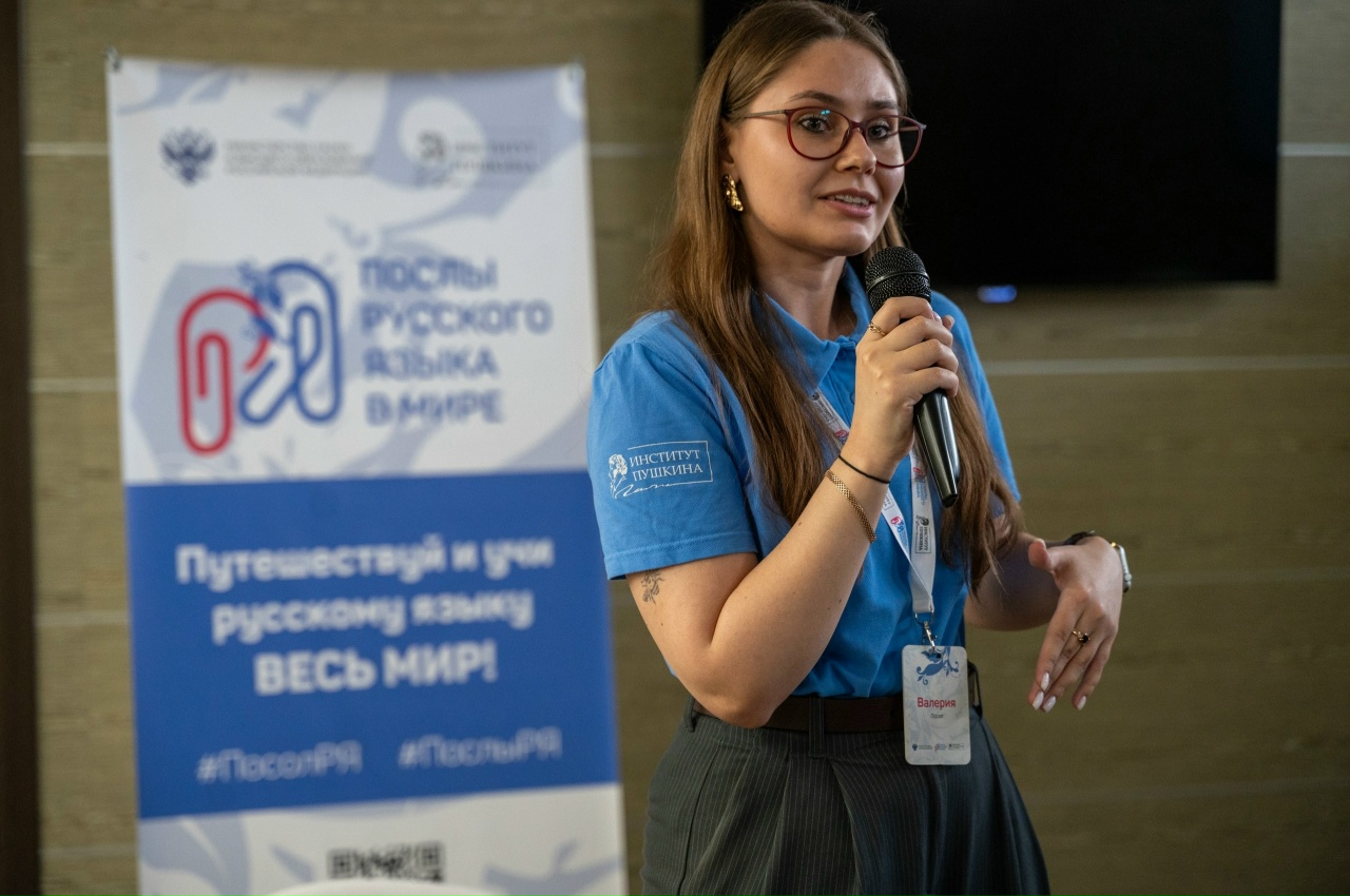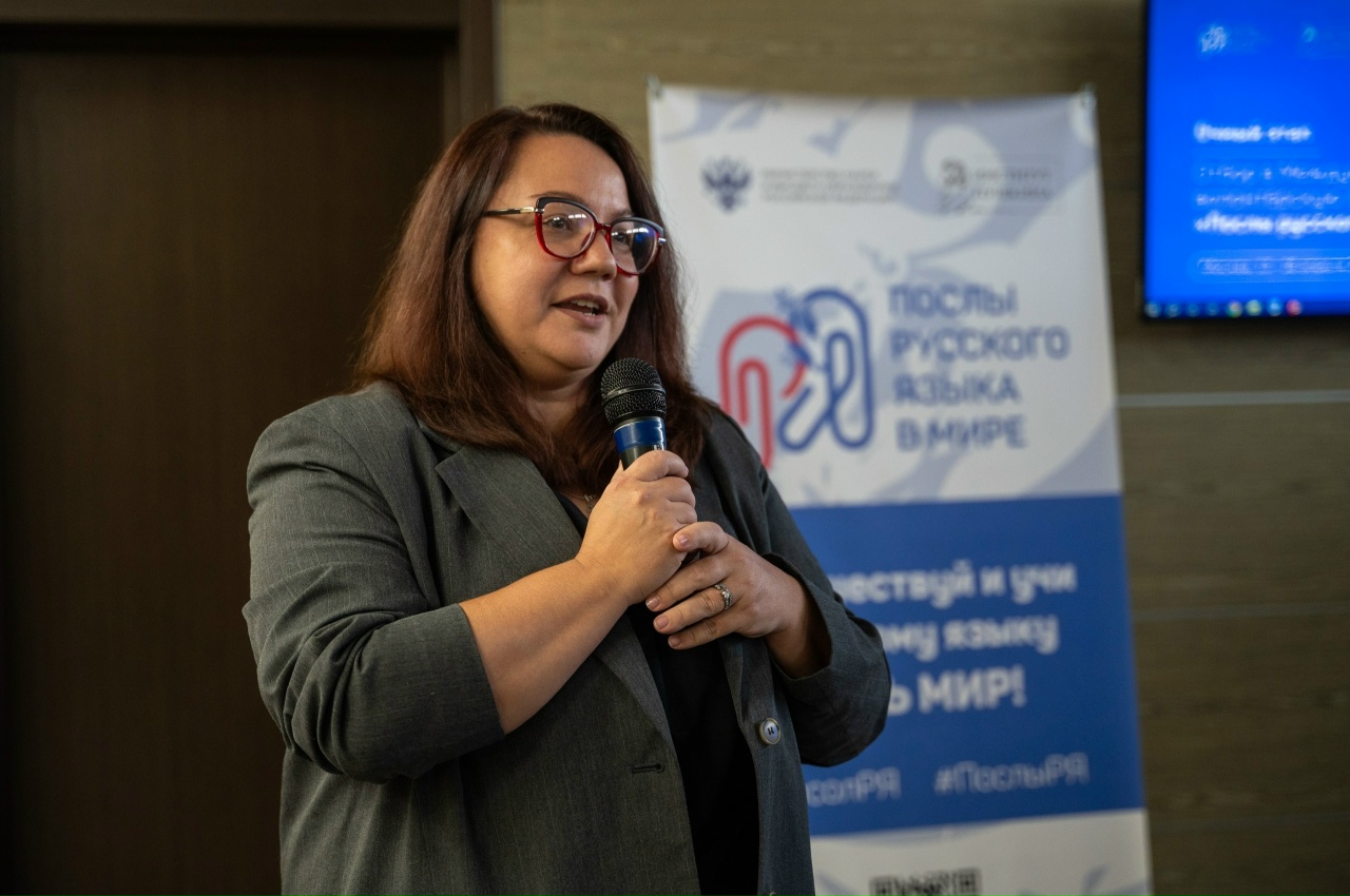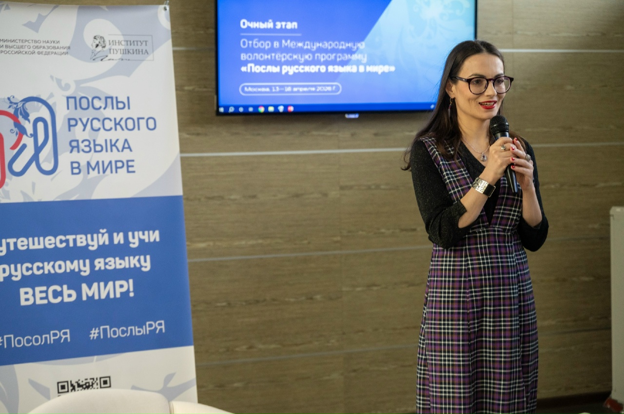 Начальник управления дополнительного образования Института Пушкина, руководитель программы «Послы русского языка в мире» Юлия Карманова познакомила участников с историей проекта и рассказала об особенностях экспедиций, в которые отправляются волонтёры.